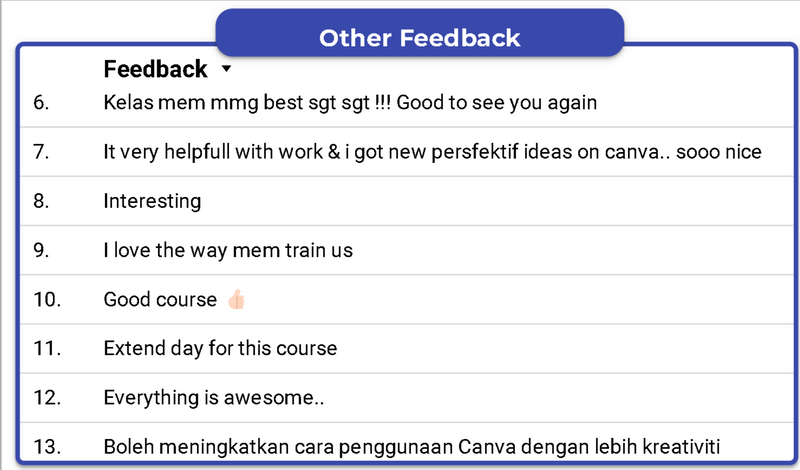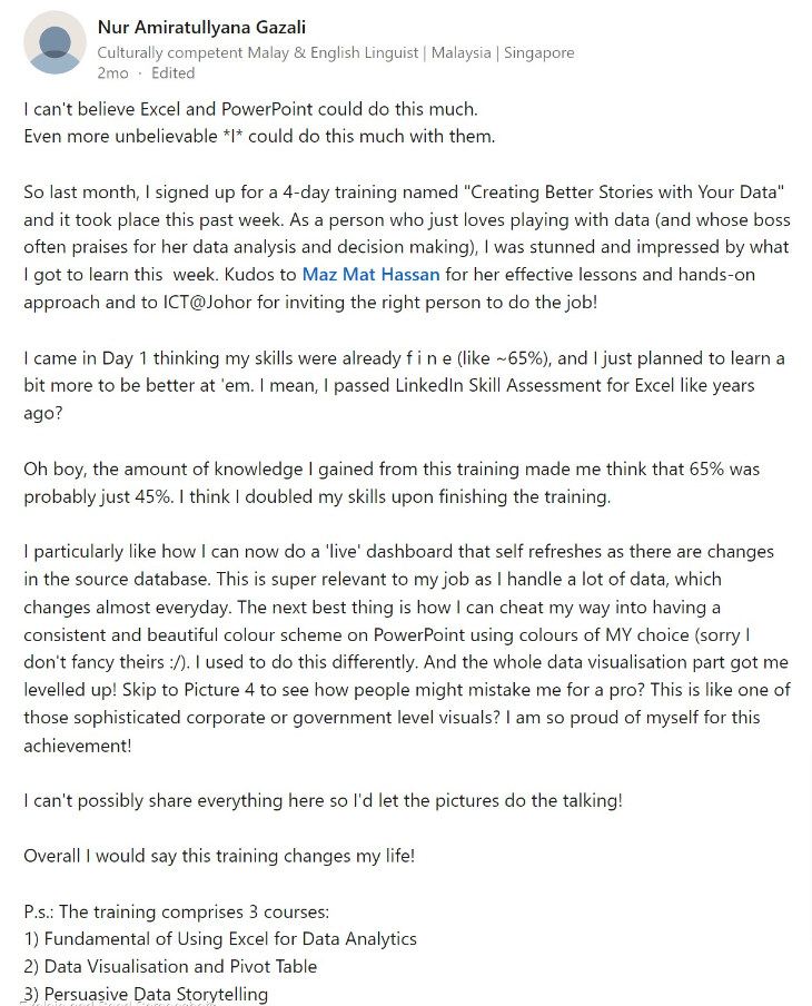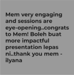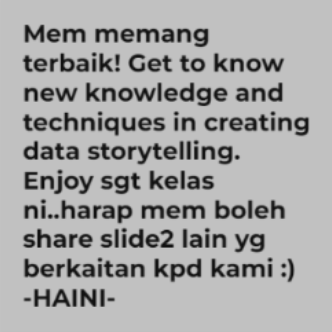 At Unoya, we believe in the power of data literacy as a pathway to growth and innovation. Our CEO, Mem Mazlita, is an accomplished ICT trainer with a passion for making digital skills accessible. Her personal experience in teaching data skills for more than a decade informs every aspect of Unoya's approach, ensuring our training remains practical, inclusive, and impactful. To date, Unoya has received 100% recommendations for all our training programmes.